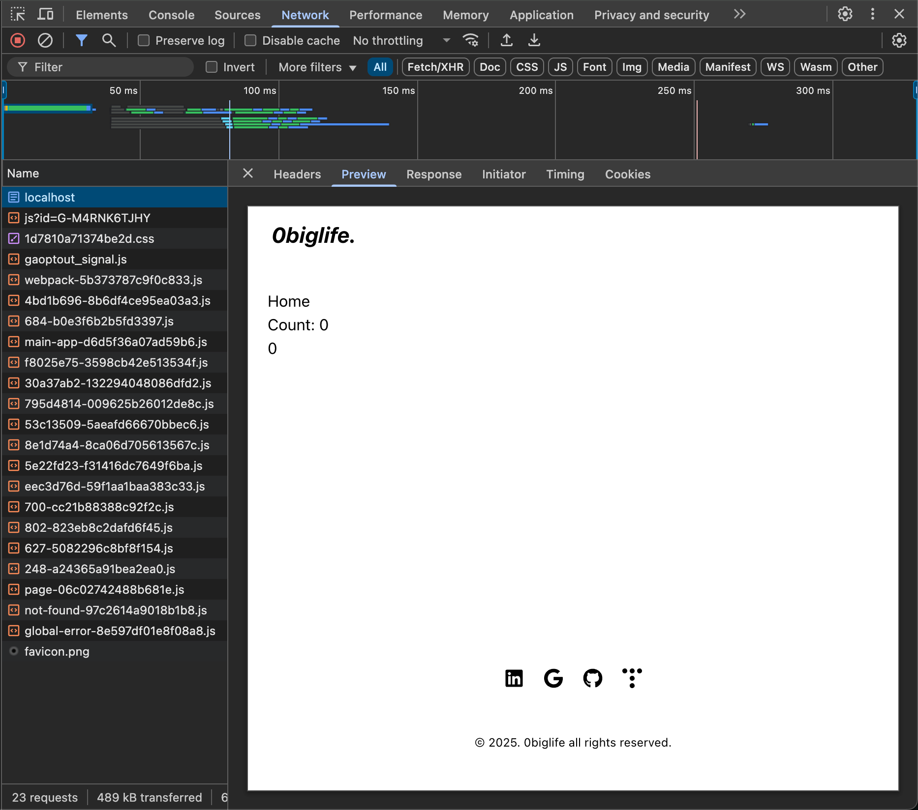 브라우저 개발자 도구 → localhost → Preview 탭을 보면 뼈대만 존재하는 HTML이 보인다. 이 시점에서는 서버에서 React가 TSC Payload를 만들고, Next.js가 JS 인스트럭션을 붙여 생성한 HTML만 렌더링되었기 때문에 버튼 클릭(인터랙션)이 동작하지 않는다.