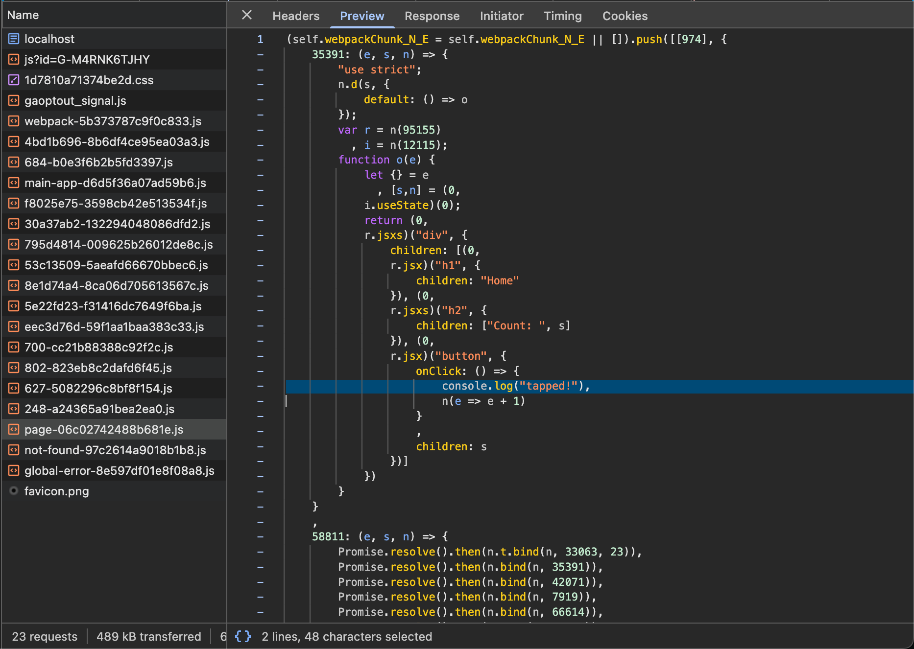 이제 클라이언트에서 Reconciliation 단계를 통해 RSC Payload를 받아서 컴포넌트 트리를 만들고, 빈 자리에 Placeholder를 채웠을테고, 위 사진처럼 tapped!가 검색되었던 js 인스트럭션 코드 조각을 받아와서 Hydrate을 하고, onClick이 이제 버튼에 붙어서 할당된 흐름이다. 이 시점부터 이제 우리는 브라우저 상에서 버튼 클릭과 같은 인터랙션이 가능한 것이다.
