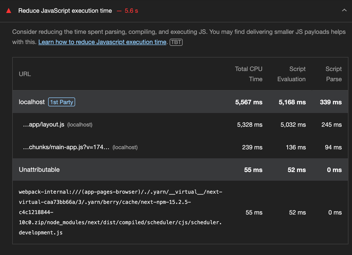CSR 방식에서 총 JS 실행 시간이 5,567ms에 달한다. 특히, app/layout.js 하나에서만 5.3초가 소모되었고, 이로 인해 메인 스레드가 장시간 점유되었다. 이는 CSR 구조에서 전체 초기 화면은 JS로 구성해야하기 때문에 불가피한 문제다.