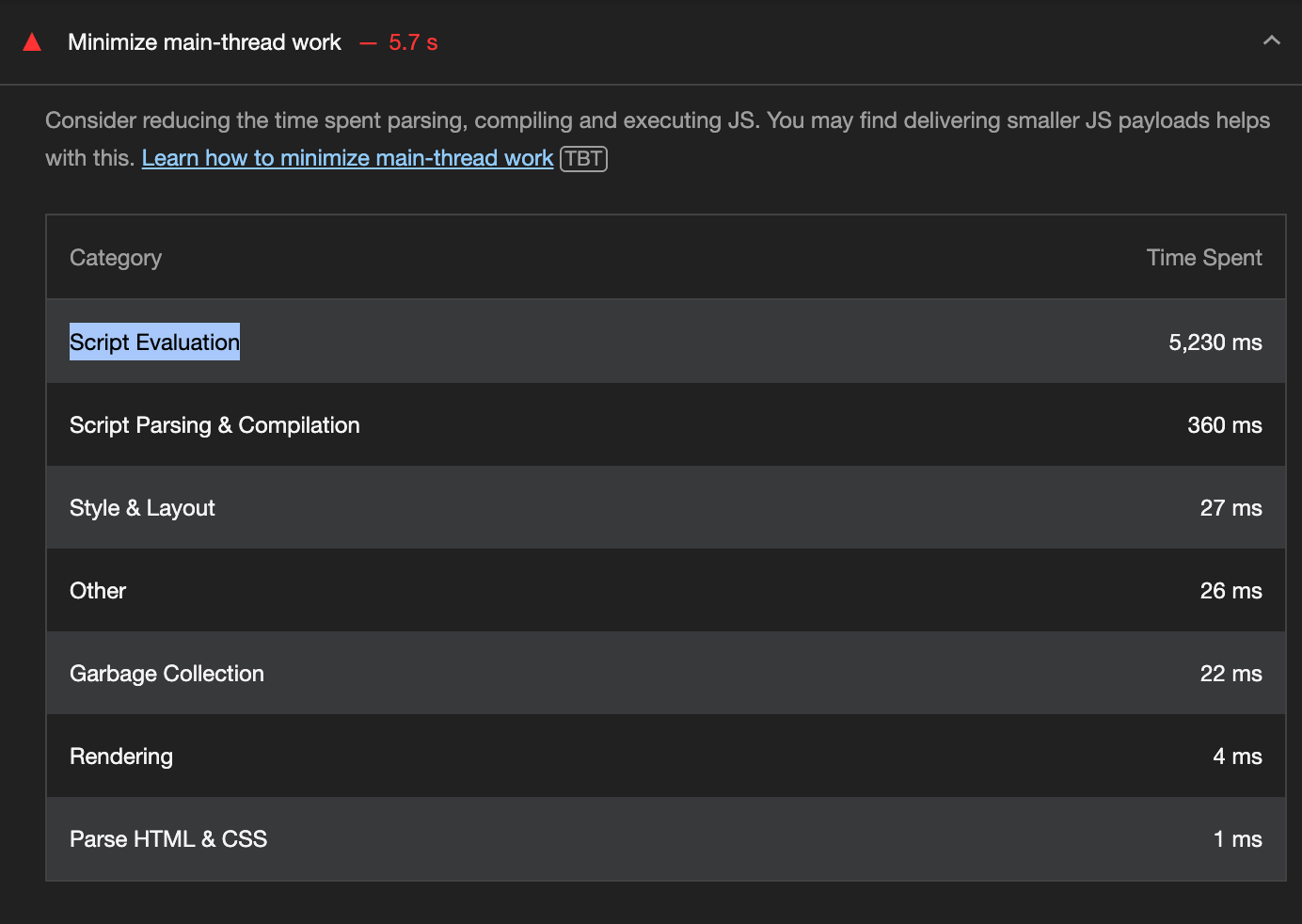 상세 내용을 보면, Script Evaluation, Parsing, Compliation 등 JS 관련 처리로만 90% 이상의 메인 스레드 작업이 발생했다. 이 역시 위에서 말한 초기 페이지가 로드되더라도 사용자가 육안이 확인하기 위한 화면은 JS 처리가 끝난 뒤에야 가능하기 때문에 문제인 것이다.
